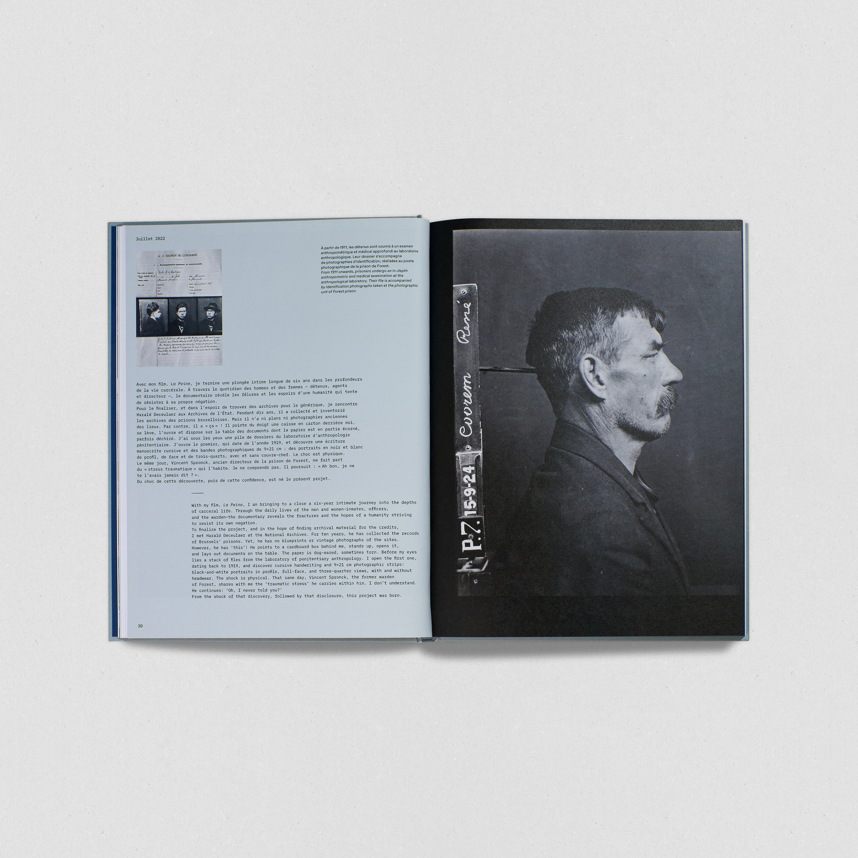 Fruit de dix ans d’enquête et d’immersion au cœur des prisons de Saint-Gilles, Forest et Tournai, l’ouvrage met en regard textes, travail photographique contemporain et archives anthropométriques inédites du début du XXe siècle. En explorant plus d’un siècle d’enfermement, ce projet documente les lieux, les corps et objets qui peuplent l’univers carcéral. Entre travail documentaire, témoignage social et création, cet ouvrage souligne l’urgence de transformer un système pénitentiaire en déliquescence.